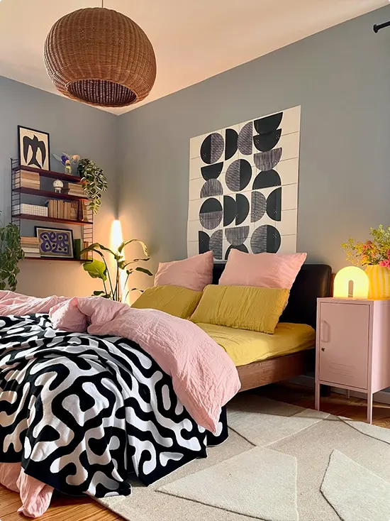 But it doesn’t play it safe. Yellow bedding underneath the throw and a pink linen duvet add warm pops of color. A round wicker pendant light and a small pink metal locker-style nightstand keep things interesting.