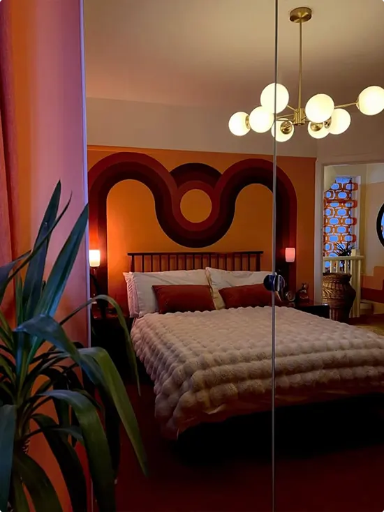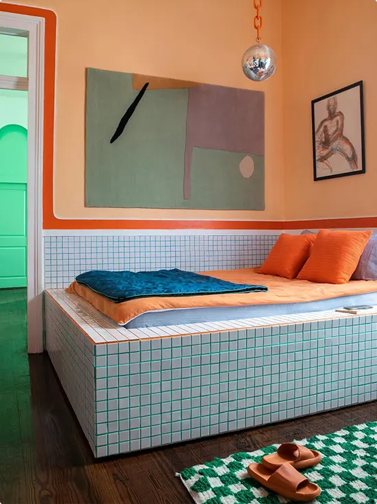 And it works. Paired with peach walls trimmed in bold orange, a color-blocked abstract canvas, and a hanging disco ball, the whole room feels like a funky art installation you actually get to sleep in.