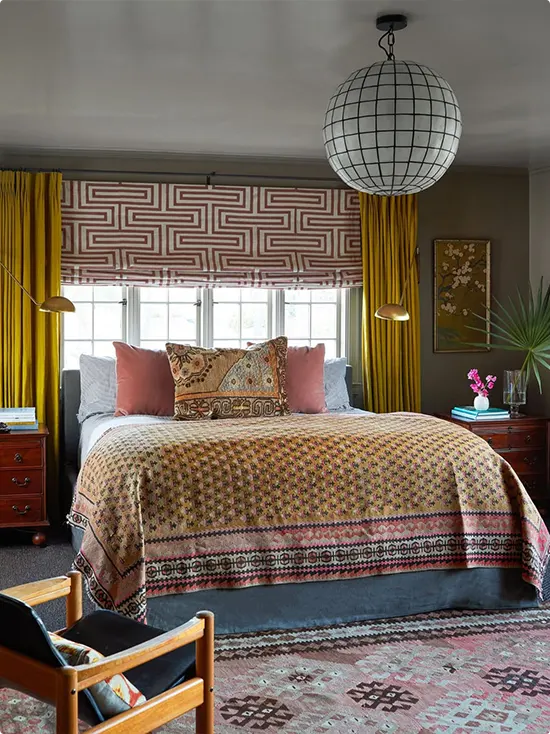 A bold geometric Roman shade, gold silk curtains, a kantha quilt bedspread, and a kilim-style area rug — all different patterns, all somehow working together. The muted, earthy tones are what keep everything from clashing.
