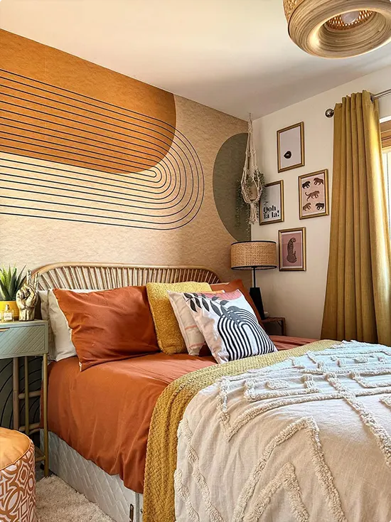 A hand-painted mural with bold terracotta arches and a sage green circle draws your eye straight to the bed.