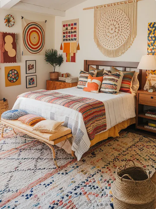 Striped and patterned throw pillows, a Berber-style rug, and a rattan bench at the foot of the bed complete the global, bohemian feel. This room is warm, personal, and completely one of a kind.