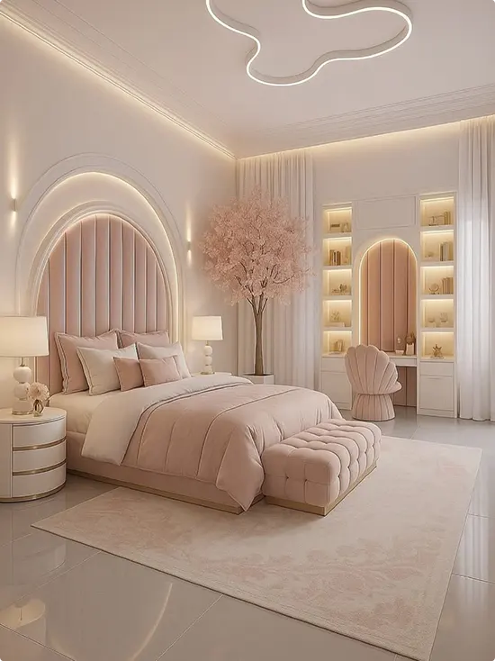 A built-in arched niche frames the blush pink channel-tufted headboard like a piece of art. Matching blush bedding, a tufted bench at the foot, and a scallop-shaped vanity chair keep the palette dreamy and cohesive.