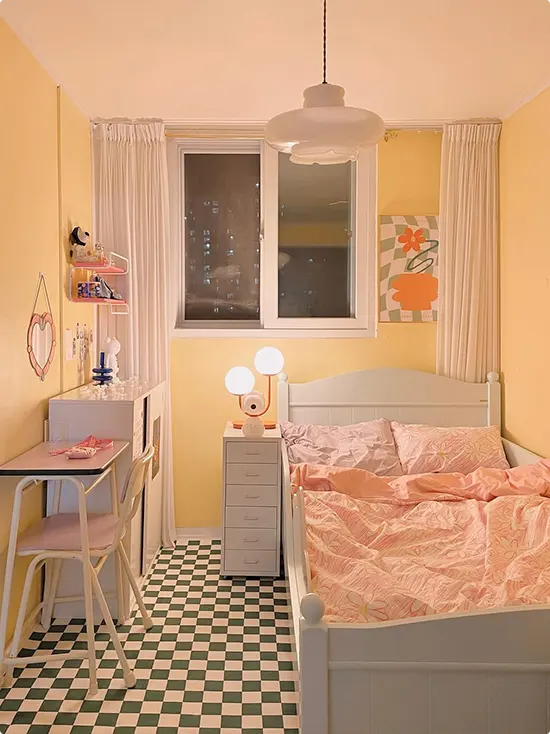 The warm buttery yellow keeps things cozy, while the checkered floor adds that funky retro energy without being too loud. Pink floral bedding softens it all nicely.