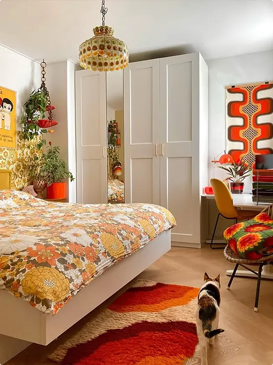 The bold orange and yellow floral duvet is the star. Everything around it — the hanging beaded pendant light, the striped retro rug, the graphic curtain panel — just adds to that warm, groovy feeling.