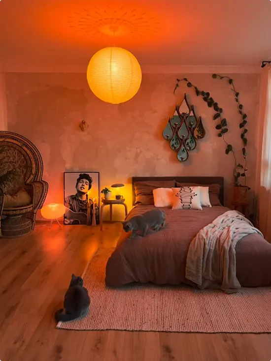 The white built-in wardrobe keeps things practical without killing the vibe. And yes, the cat wandering across the rug is the perfect finishing touch.