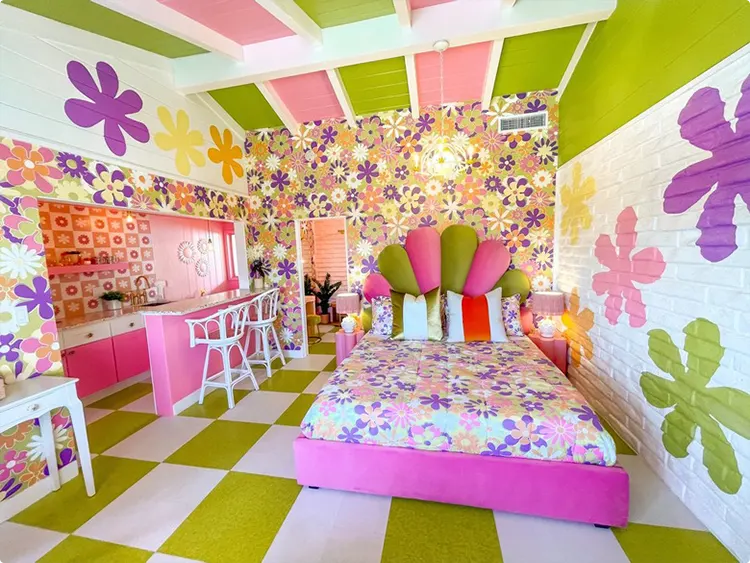 Flower wallpaper, flower-painted walls, flower-print bedding, and a flower-shaped headboard — it’s a full commitment to the theme. The lime green ceiling beams and pink checkered floor keep the retro-60s feeling going strong.