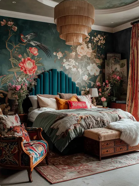 Painted flowers, birds, and branches stretch across the wall like a living tapestry. The tall teal velvet headboard with its sculptural ridges is the perfect companion.