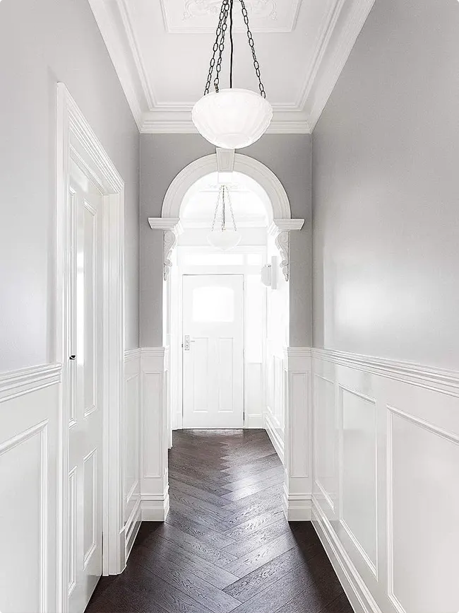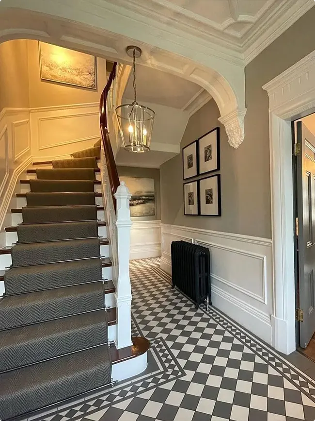Victorian details like ornate archways and ceiling moldings make a hallway feel grand. This one leans into that history beautifully.