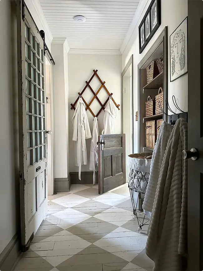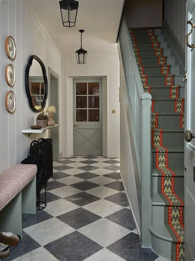 That diamond-patterned floor is the star of this hallway. Gray and white tiles laid on the diagonal create movement and interest.