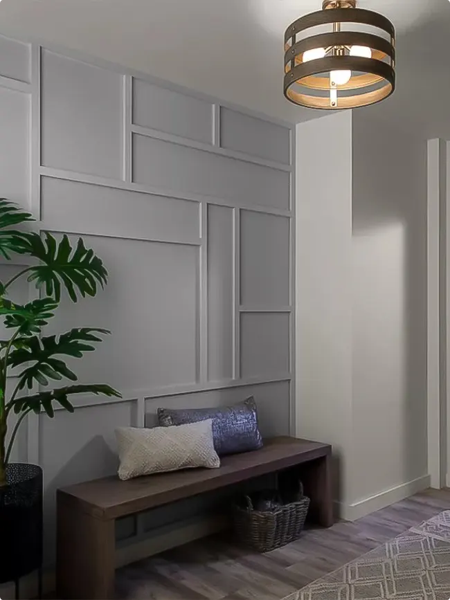 An accent wall with geometric paneling in gray adds dimension without paint or wallpaper. It’s all about the trim work.