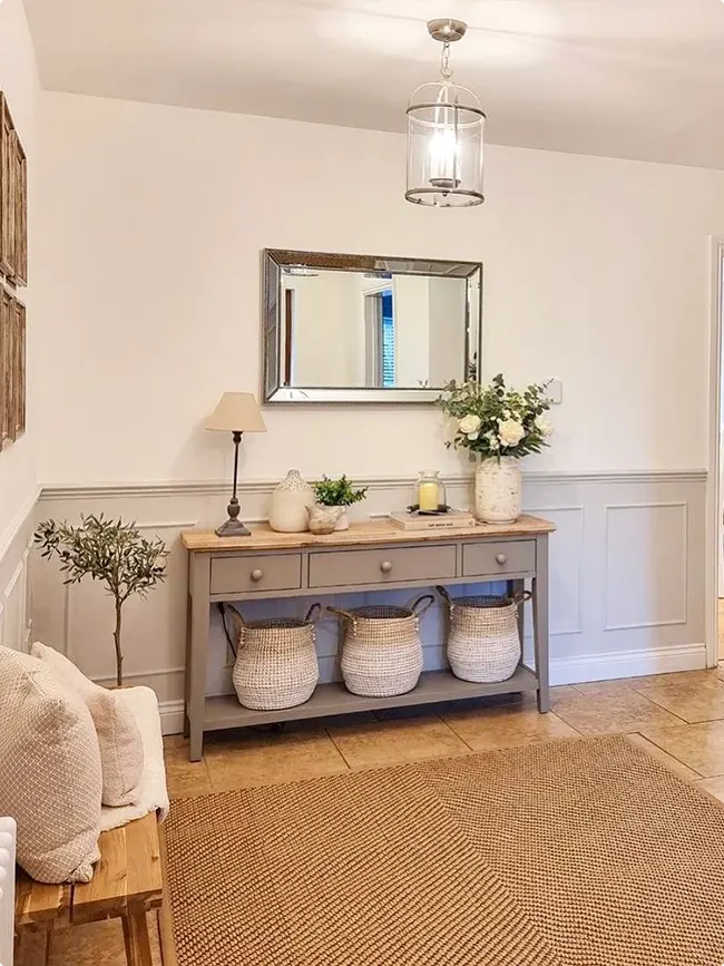 Gray paneling on the lower walls sets a calm tone. White console table holds candles and greenery without looking cluttered.