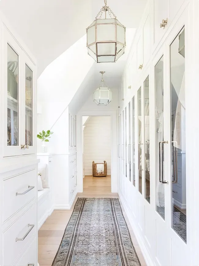 White cabinets with glass-front doors line both sides of this hallway. It’s functional storage that doesn’t feel cramped.
