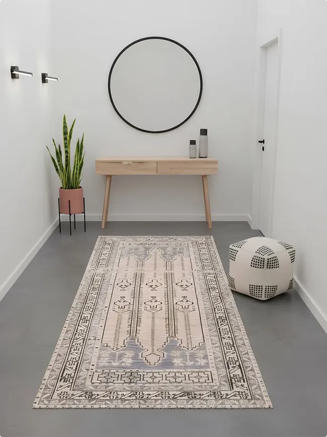 Those geometric pendant lights add visual interest overhead. The vintage runner in muted gray and taupe tones adds pattern without overwhelming.