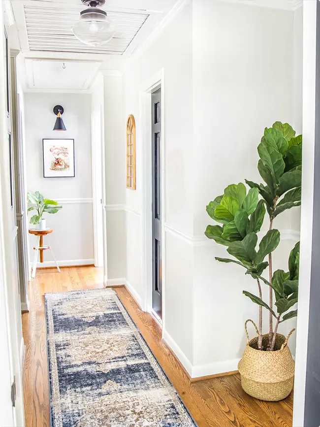A tall fiddle leaf fig can make any hallway feel more alive. This one sits in a natural basket planter that adds texture.