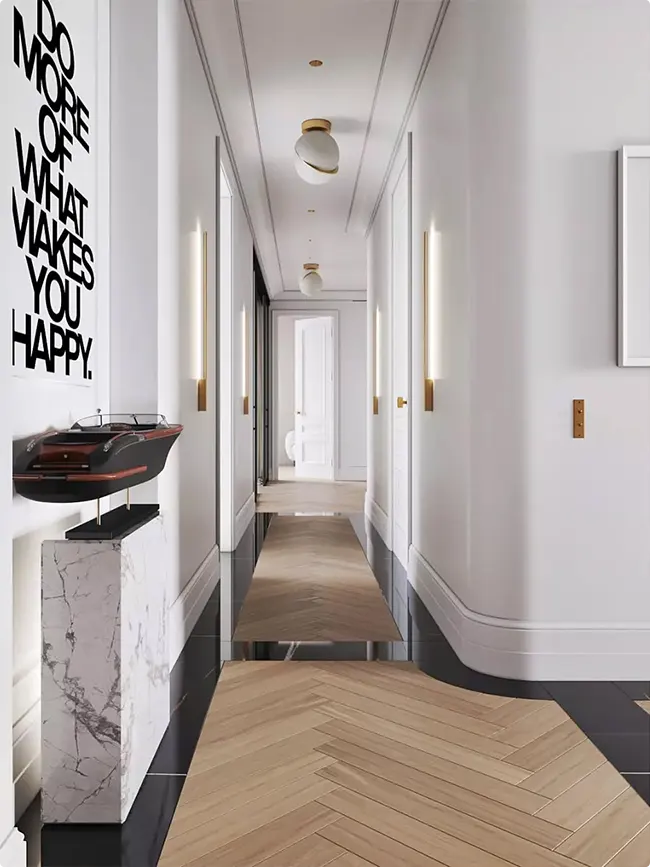 The glimpse of natural wood at the end of the hall draws your eye forward. It’s proof that a hallway can be both practical and pretty.