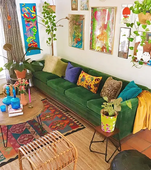 This deep green couch is almost upstaged by the vibrant art and all the plants. Almost. The colorful gallery wall and the patterned rug make this space feel alive and creative.