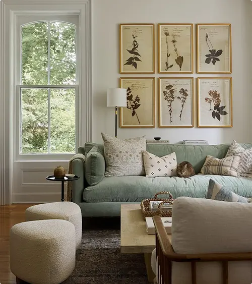 Six matching botanical prints in gold frames create a calm, symmetrical focal point above this sage couch. The prints look like pressed plants, which brings a natural, earthy feel to the space.