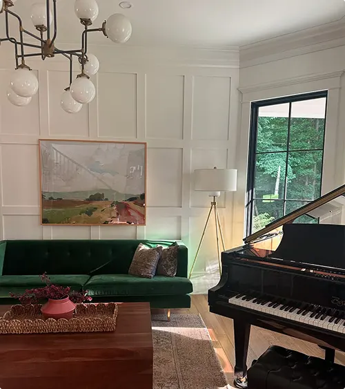 A green couch shares the room with a grand piano, which immediately makes the space feel elegant. The abstract landscape painting above the couch brings in soft, pretty colors.