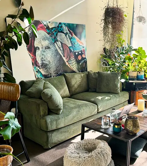 Hanging plants and potted greenery make the space feel like a little jungle. The black coffee table and the mix of pillows keep it from feeling too one-note. It’s eclectic and personal, the kind of room that tells a story.