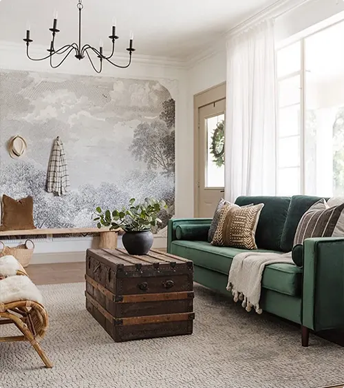 A teal velvet couch sits in front of a dreamy mural wall that looks like a misty landscape. The mural is soft and subtle, which makes the rich couch color stand out even more.