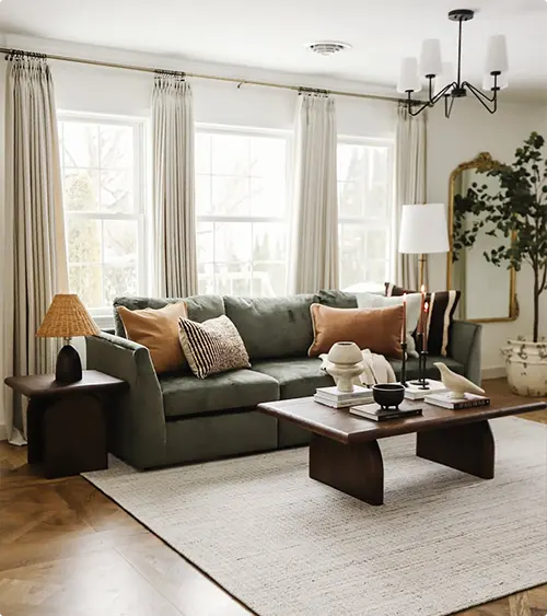 This sage green sectional sits in a bright room filled with natural light from three large windows. The long curtains and the warm wood floors create a cozy, grounded feeling.