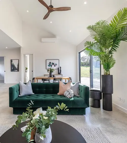 A deep emerald sectional looks stunning in this modern space with vaulted ceilings. The tall palm in a black planter is basically a piece of living sculpture.