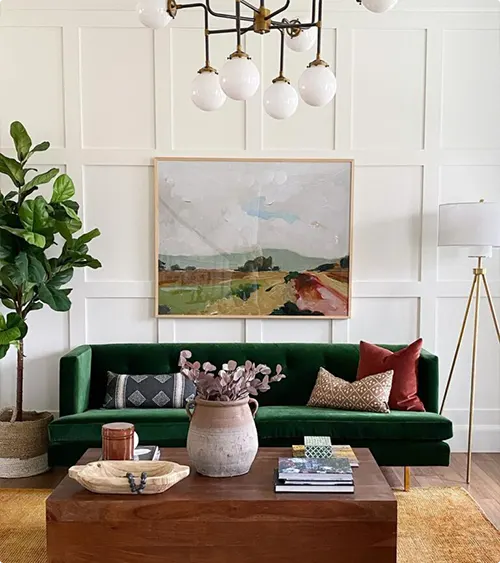 White paneling makes this emerald couch pop in the best way. The abstract landscape painting above it brings in soft colors that complement the green without competing with it.