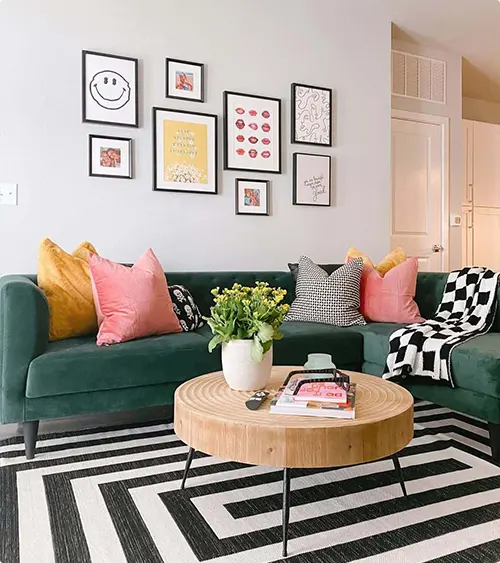A forest green sectional gets a fun update with bright pink and mustard pillows. The gallery wall is casual and cheerful, with everything from smiley faces to food prints.