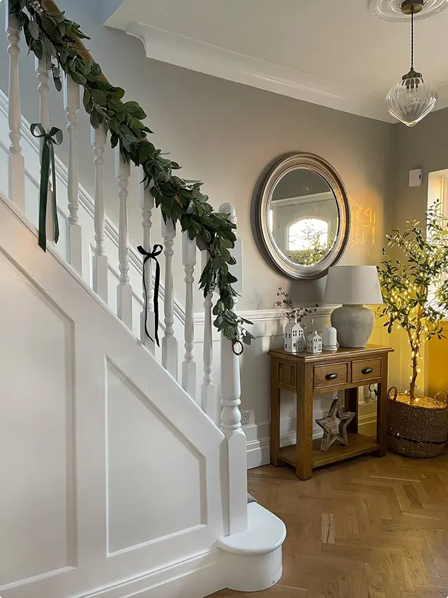 The wooden console table underneath holds a lamp and some seasonal decor. That round mirror above reflects light and makes the space feel bigger.