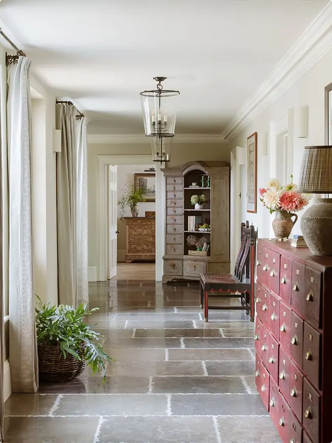 Large stone tiles give this hallway a rustic feel. They look like they’ve been there forever.