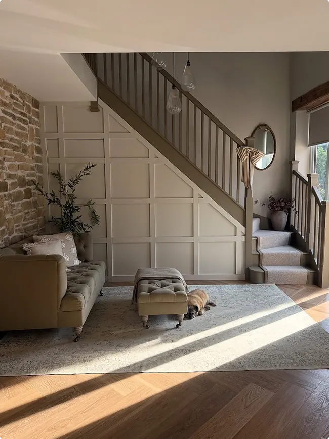 Wall paneling under the stairs adds architecture to blank space. Paint it to match your walls or go contrasting.