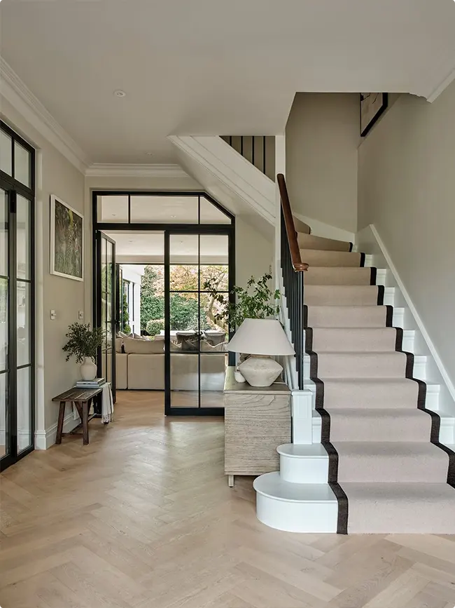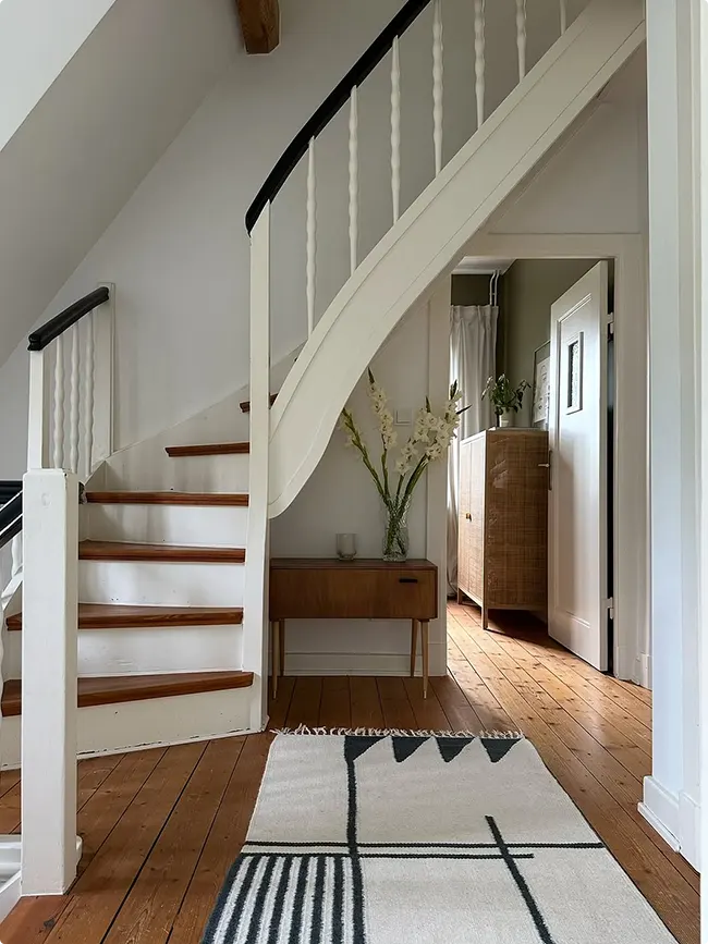 The staircase runner in neutral tones keeps things soft. I like how the wooden console at the base of the stairs creates a landing spot for keys and mail.
