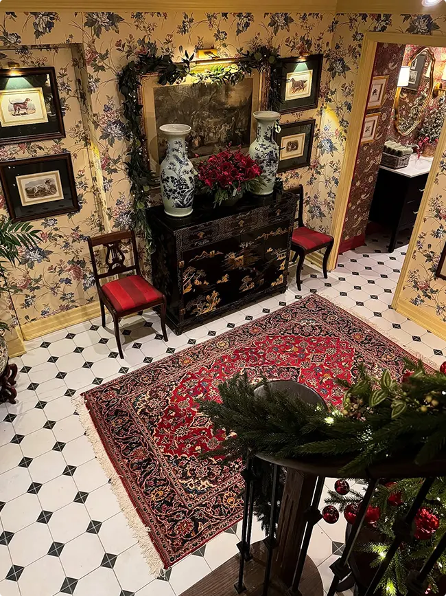 That red Persian rug and the black-and-white checkered floor create even more pattern. It’s bold but somehow cohesive.