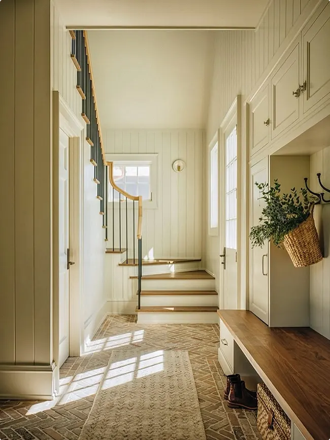 White paneling, soft beige walls, and a simple bench make this hallway feel easy and lived-in.
