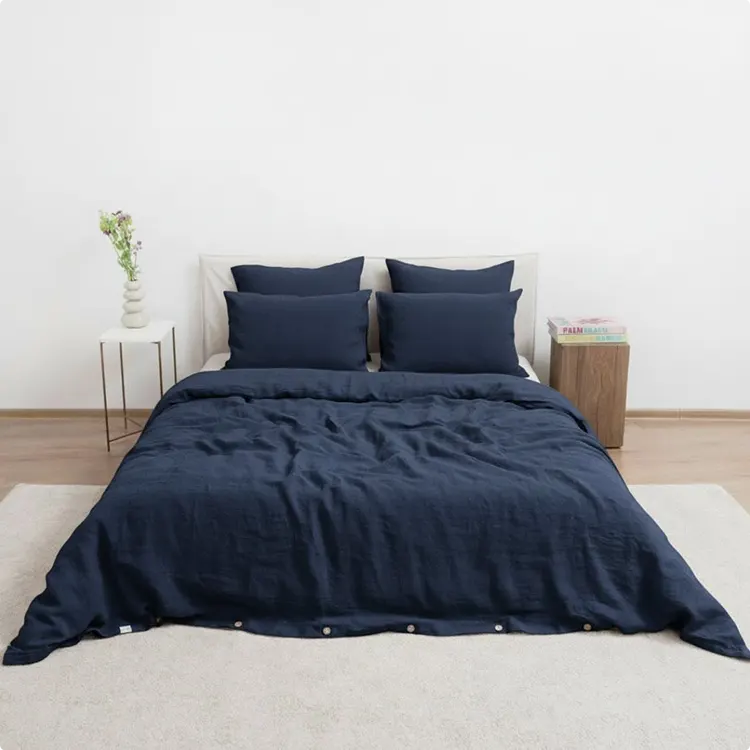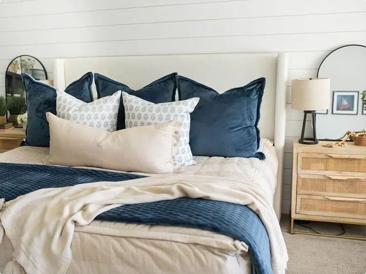 Navy bedding makes the bed feel calm and neat. It’s great for a relaxed look.