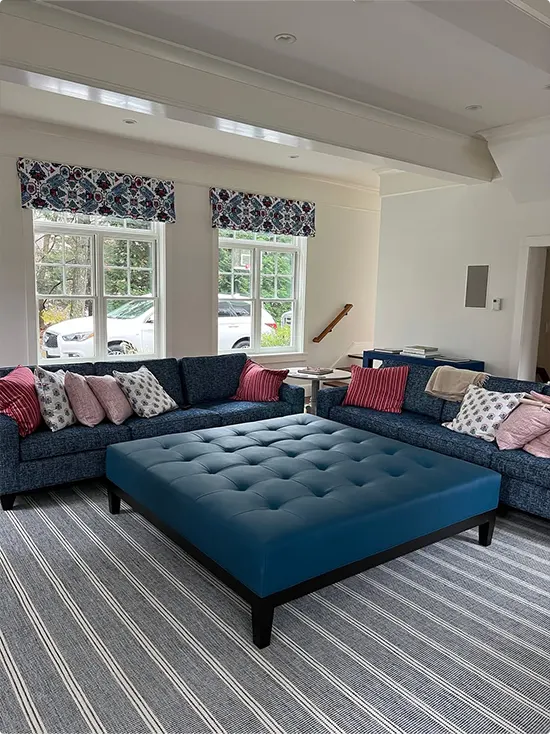 A navy rug grounds the whole room. It sits nicely on wood floors and even better on light tiles.