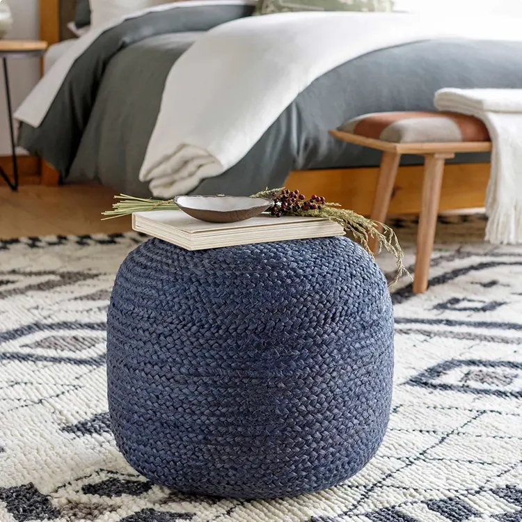 A navy ottoman works as a table and a seat. Pretty useful, right?