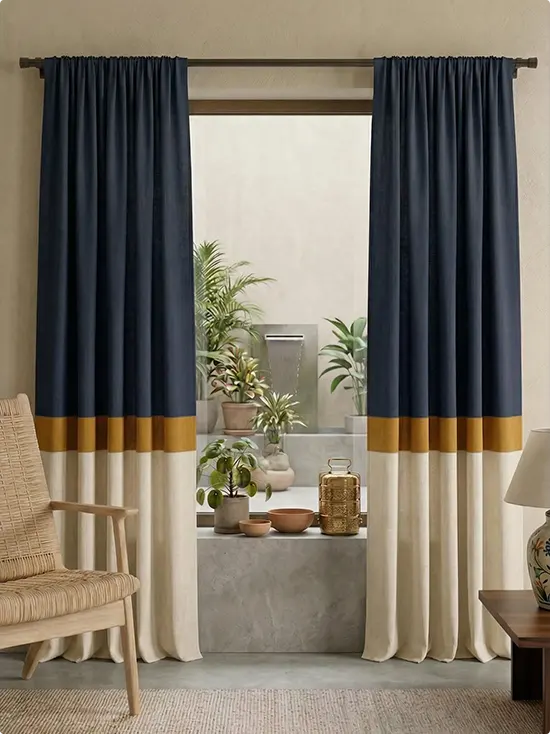 Navy curtains frame the windows nicely. They make the room feel taller.
