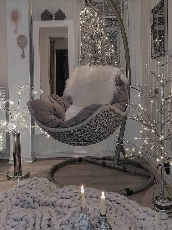 Dreamy Gray Egg Chair With Fairy Lights and Chunky Knit Rug