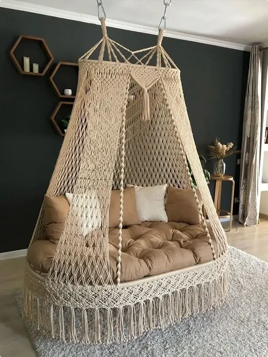 Oversized Macramé Canopy Hammock Bed Against Dark Walls