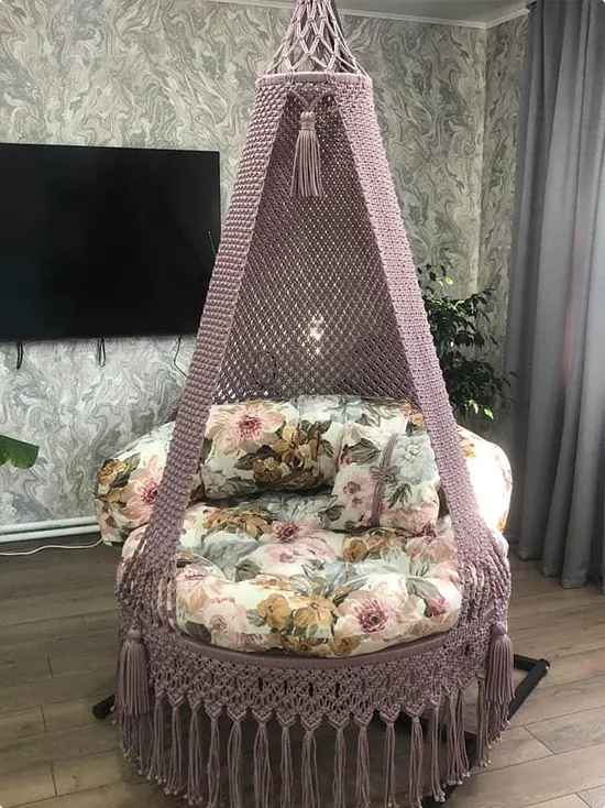 A dusty pink macramé canopy chair sits on the floor with a floral cushion inside — pinks, yellows, and greens all mixed together.