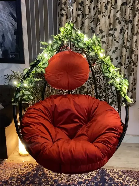 Bold Red Cushion Egg Chair With Vine and String Lights