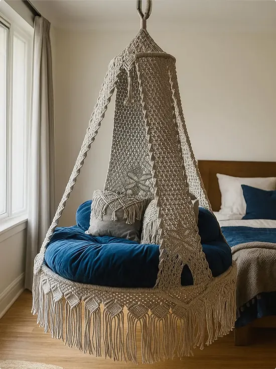 A large macramé canopy chair hangs near a bedroom window, filled with a plush blue velvet cushion and a few throw pillows.