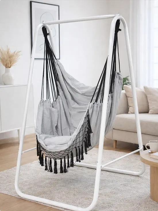 A gray hammock chair hangs from a clean white A-frame stand in a soft, neutral living room.