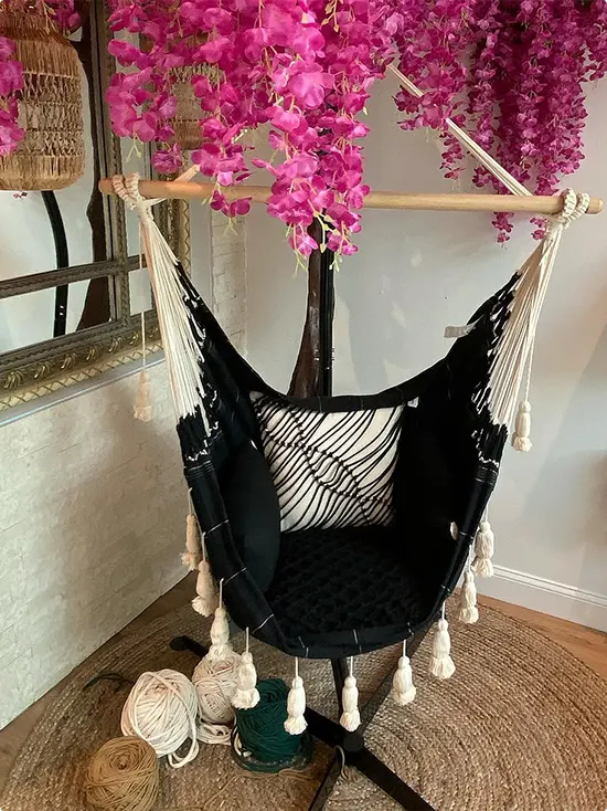 A cream macramé circle chair hangs from a black A-frame stand in a simple corner.