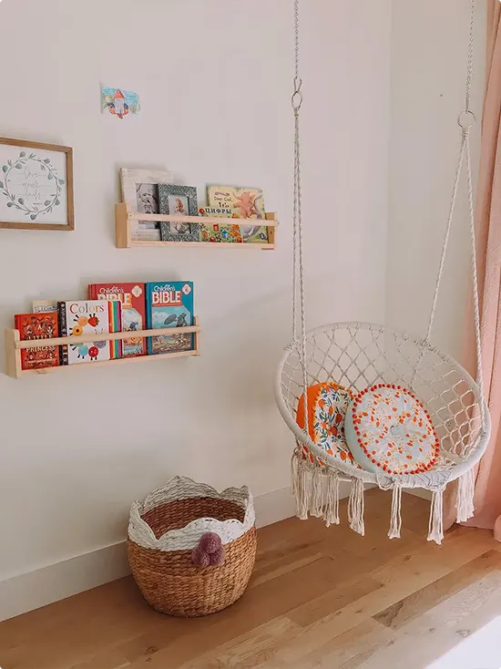 A white macramé circle chair hangs in a soft, warm children’s room next to two small wooden book ledges filled with colorful kids’ books.
