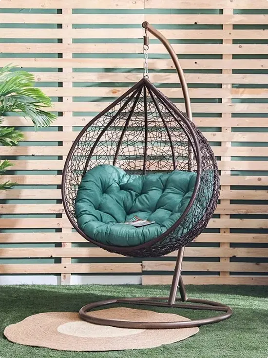 A teardrop-shaped dark rattan egg chair hangs from a curved stand, with a rich teal cushion inside.