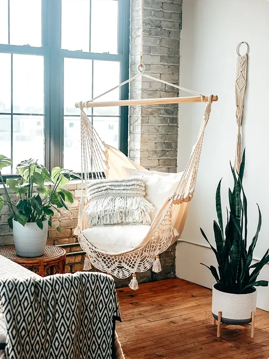 Boho Macramé Hammock Chair by a Brick Wall and Big Windows