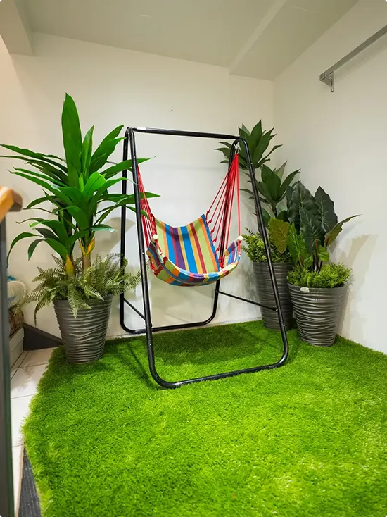A bright striped hammock chair sits on a patch of fake grass, surrounded by potted plants in a compact corner.