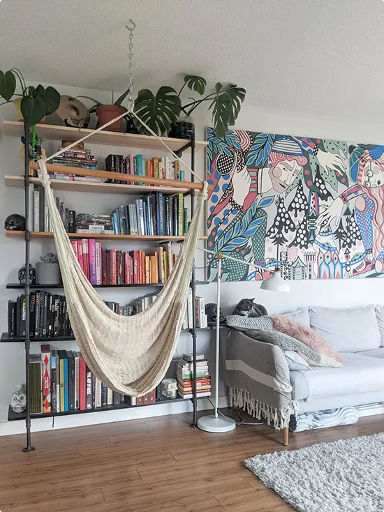 This setup works so well because the hammock doesn’t compete with the shelves, it just becomes part of the whole cozy, creative wall.